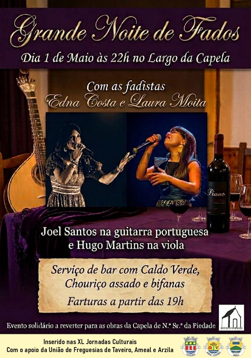 O Grupo Amigos de Taveiro, dia 1 de maio por voltas das 22:00H convida toda a população a estar presente na Noite de Fados, no largo da capela de Taveiro, com as fadistas: Edna Costa e Laura Moita. Joel Santos na guitarra portuguesa e Hugo Martins na viola.